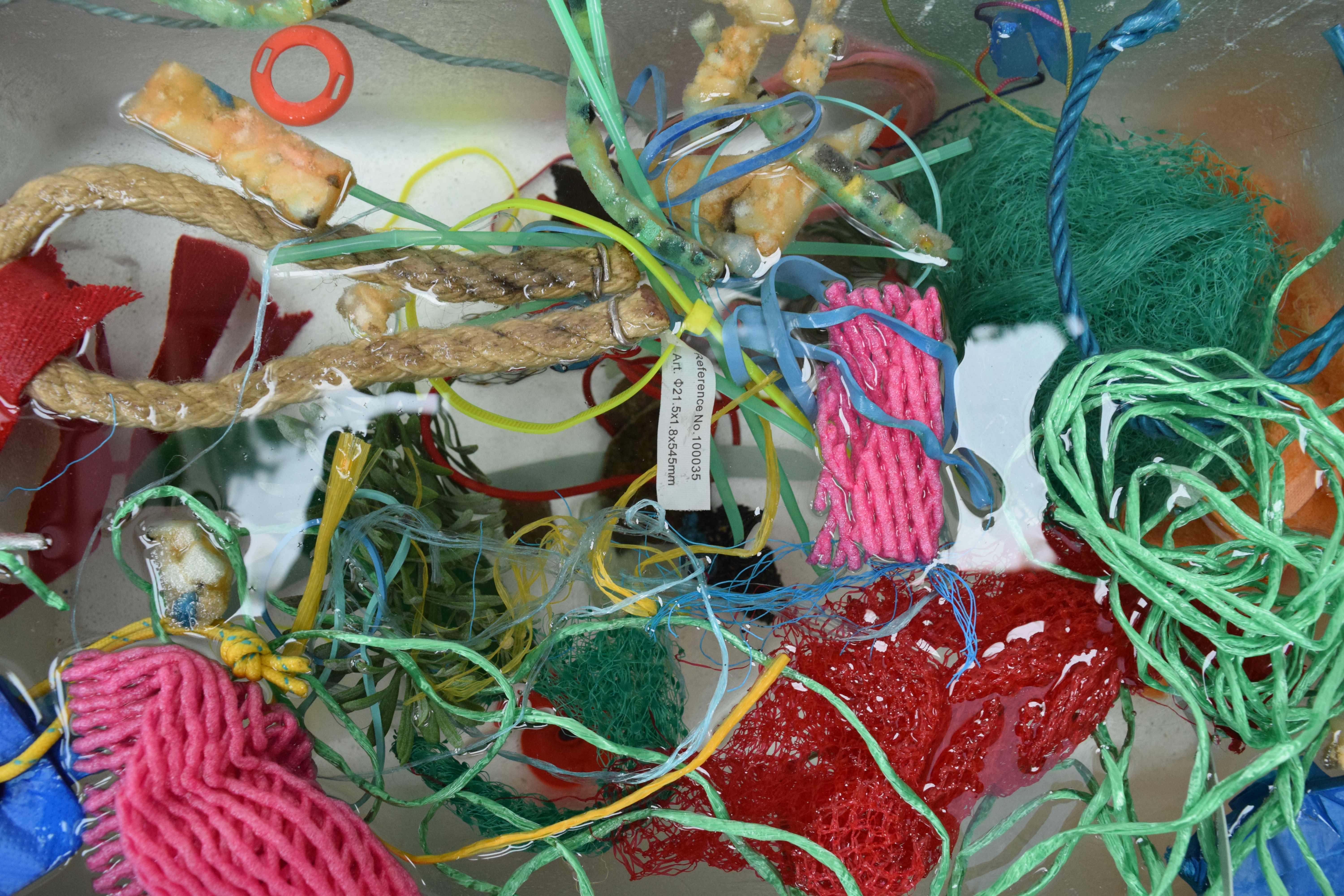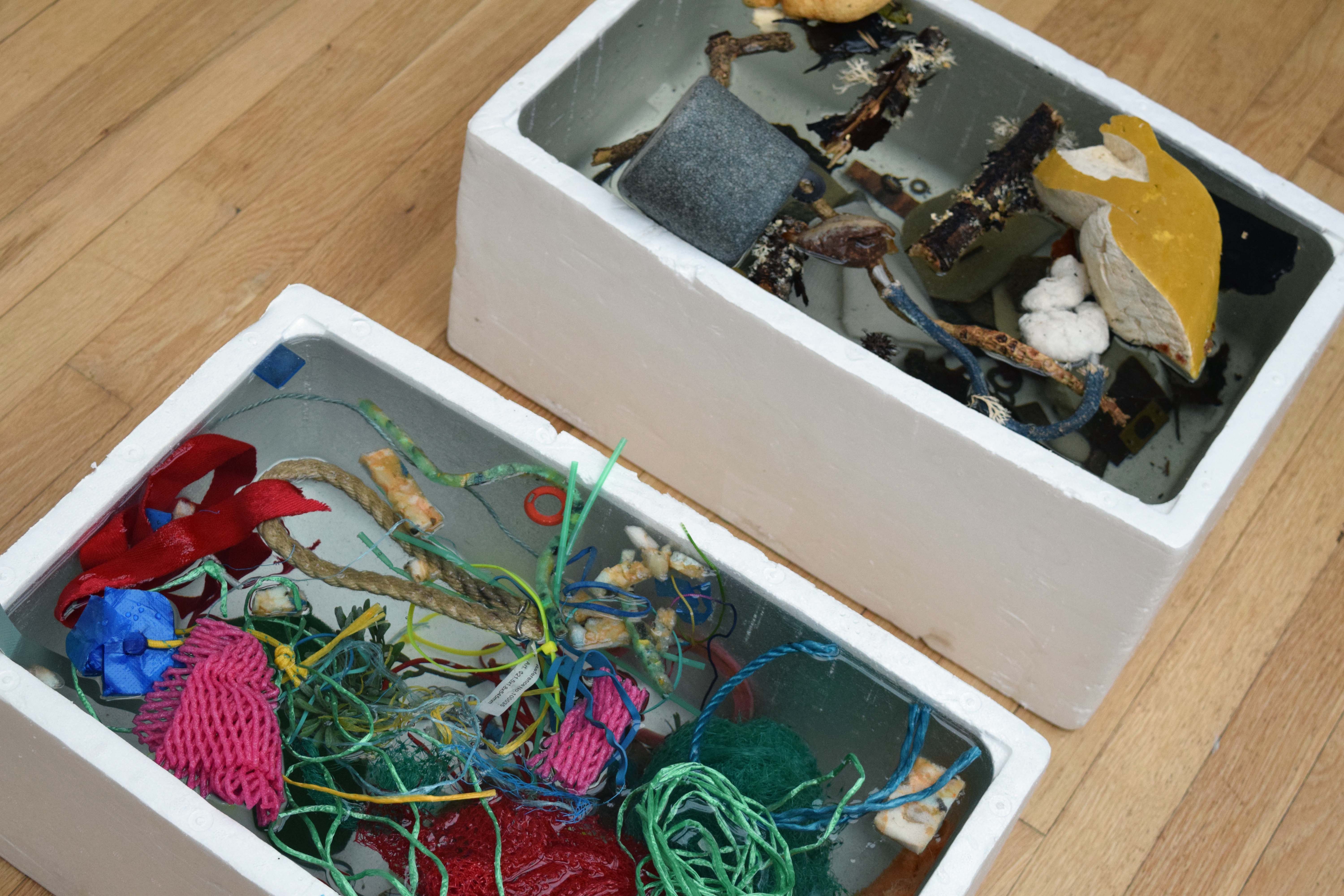 Polystyrene, found objects, water.
